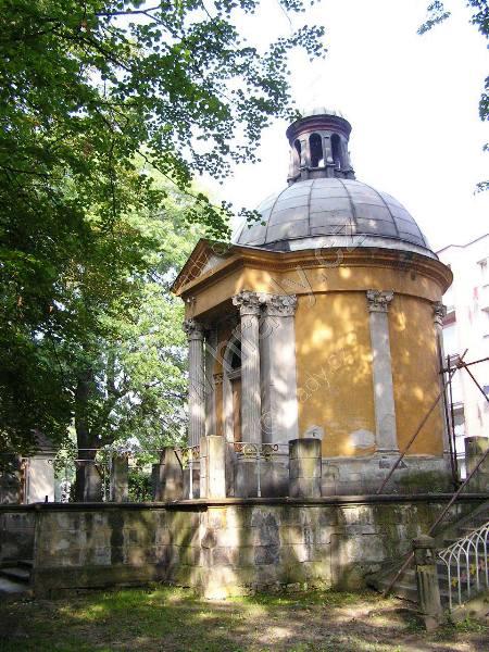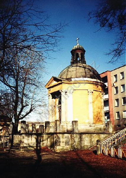 Pohled z parku kolem kostela na opravenou věž a neopravenou část kostela.