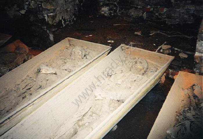 Mumie utonulých poutníků v kryptě úod kostelem.