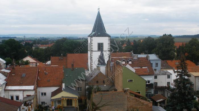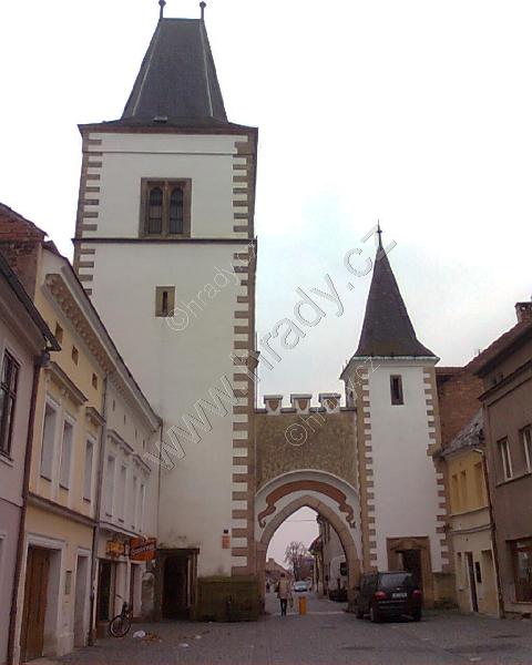 Pohled na dvojvěží brány ze zvonice u kostela sv. Vavřince