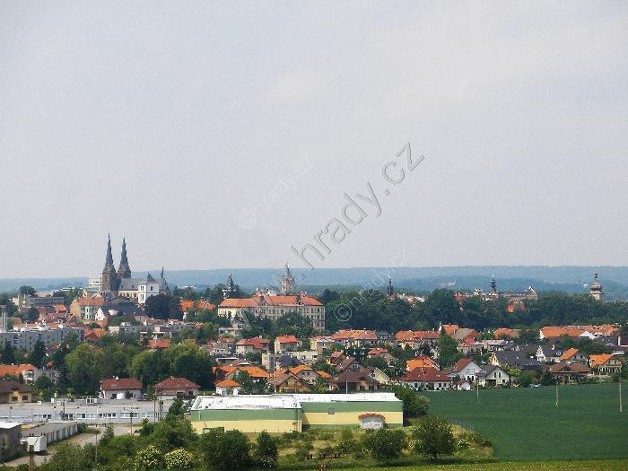 Pohled na panorama města s věžemi kostela a městských bran ze skládky sutin u města. Věž Litomyšlské brány je vidět mezi stromy mezi kostelem a velkou žlutou budovou ZŠ.