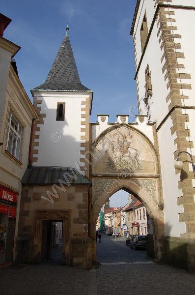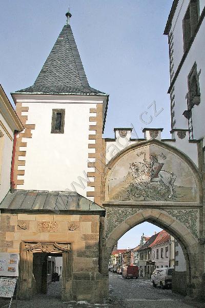 Bránu zdobí freska podle návrhu Mikoláše Alše, znázorňující městský znak.