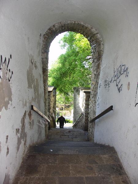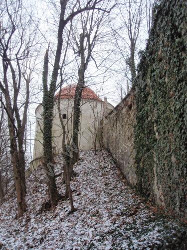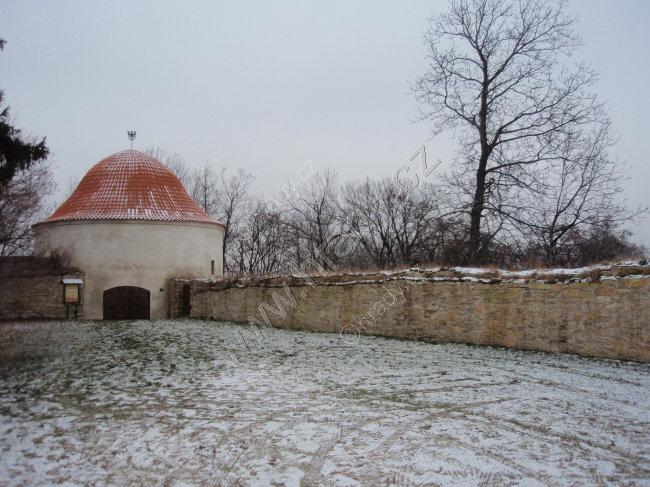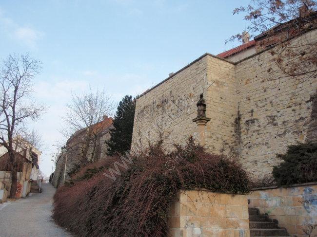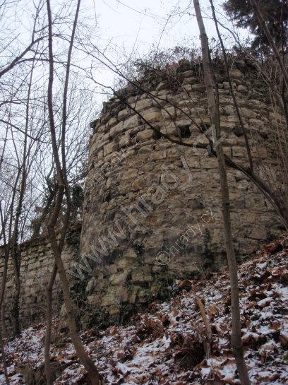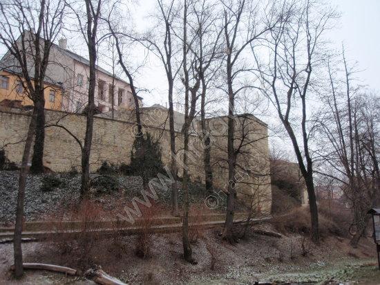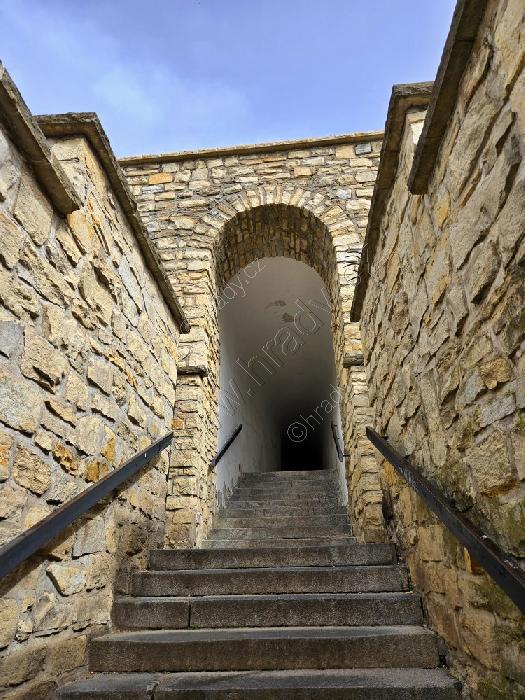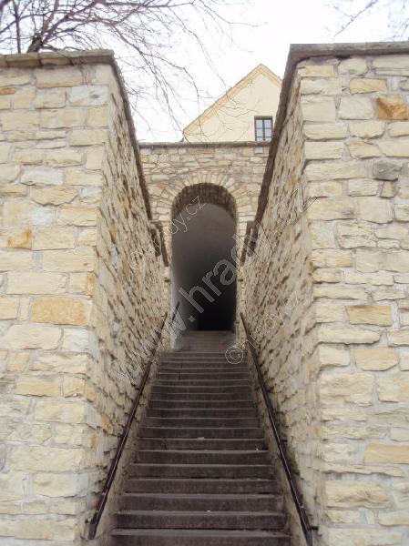 černě: části dochované, červeně: části rekonstruované na zakládě plánové dokumentace, žlutě: brány