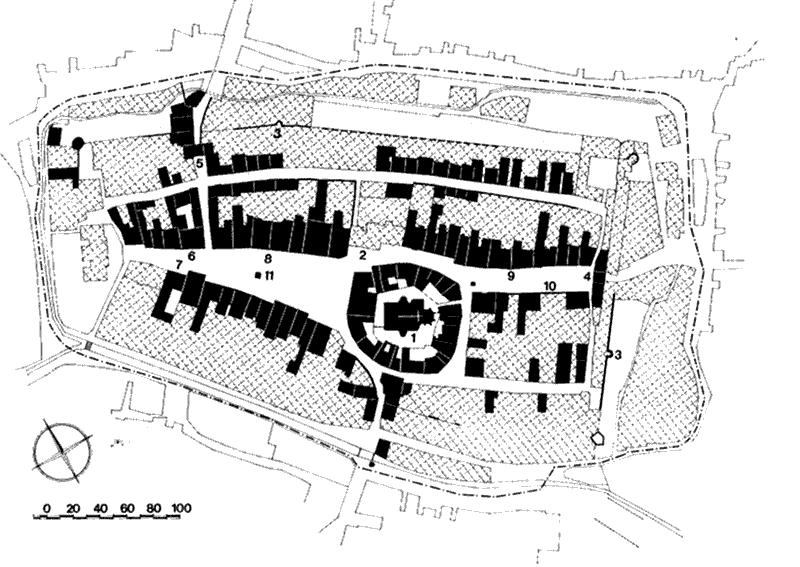 Hlavní hradba u severozápadního nároží města, využitá ke stavbě bytového domu