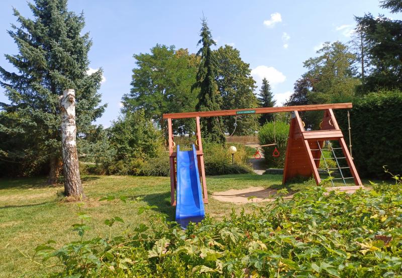 Prostorům vnějším se zřejmě už nedostává náležité pozornosti. Přerostlé křoviny, plevel. Asi by to chtělo lepšího zahradníka. Na druhou stranu je skvělé, že malé neposedné děti se mohou vyřádit na dětském hřišti, než se celá společnost nasytí.