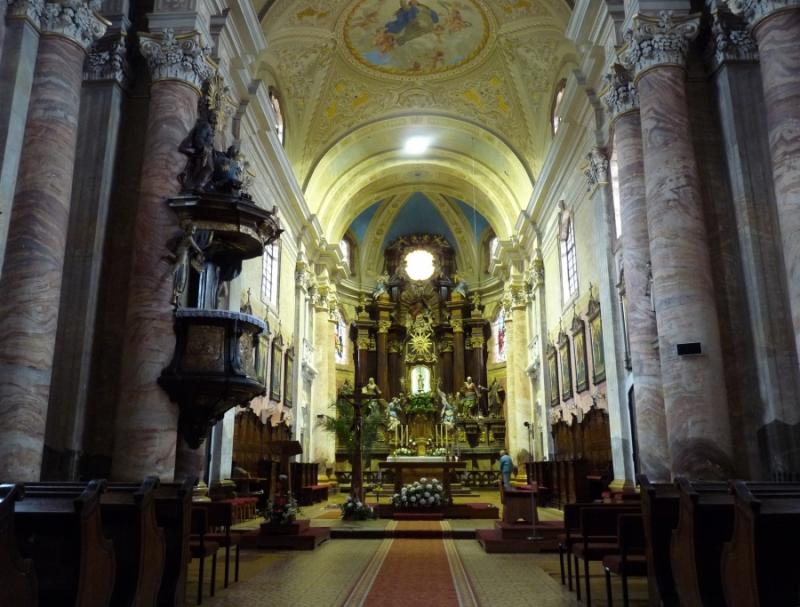 Barokní chrám je jednolodní stavbou s půlkruhovým presbytářem. V interiéru se nachází velmi bohatá výzdoba a výmalba, oltář se středověkou soškou Madony nebo klasicistní náhrobek hraběte Františka Seilerna, který byl ve své době patronem kostela, jež zaplatil varhany pro tento kostel. V rámci projektu Otevřené brány je interiér kostela přístupný veřejnosti od května do září, přilehlý klášter je od roku 1996 ve správě karmelitánek.