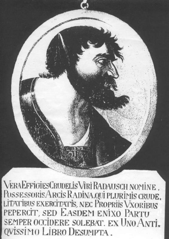 Radoušovi se pro jeho vzhled lidé vysmívali, a tak z něj vyrostl zatrpklý a zlý mladík toulající se po lesích jako divá zvěř. S pomocí skřítků vystavěl hrad a pojmenoval ho po sobě – Radyně. Oženil se s krásnou ženou, ale jejich syn byl stejně ošklivý, jako otec. Radouš v zoufalství dítě i ženu zabil a pohřbil v hradním sklepení. To celé se opakovalo s dalšími manželkami a dětmi, teprve sedmé ženě se podařilo včas uprchnout.
