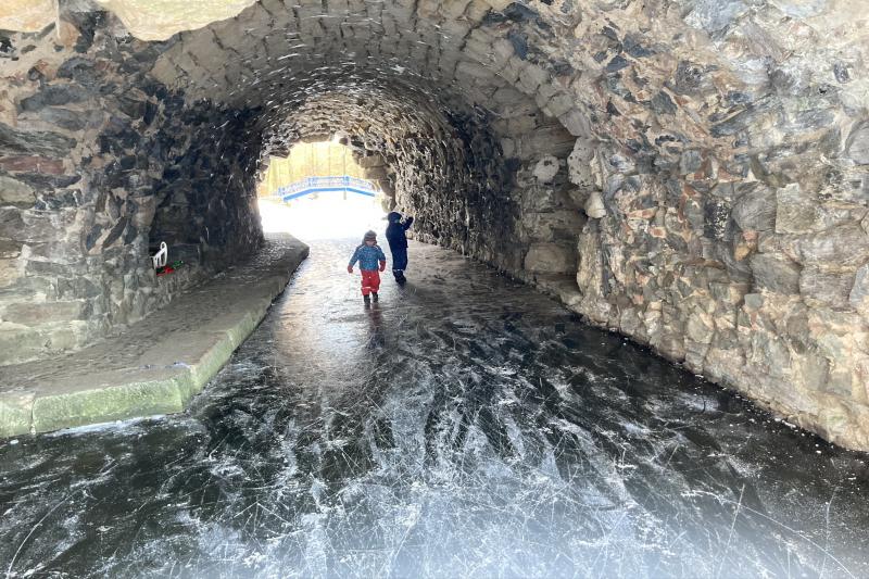 Částí parku protéká Mlýnský potok, z něhož odbočuje umělé rameno, které je ještě před úrovní Železného mostu po celé své délce zamrzlé a tím skýtá jedinečnou možnost procházek po "hladině vodního toku" s neobvyklými výhledy a nebo co více, úžasného bruslení na cca 1,5 km dlouhé vodní ledové cestě. Po cestě na Vás čeká jeden asi 10 m dlouhý úsek, který sice u Vosoušského mostku musíte přejít, neboť voda se schová na chvíli pod zem, ale tato malá překážka je spíše příjemným zpestřením. Poté podjedete Poustevníkovu lávku a po 350 m uvidíte již vyhlídkovou lávku a romantické zříceniny Egyptského pavilonu s tunelem, ve kterém je led krásně hladký a čirý.
