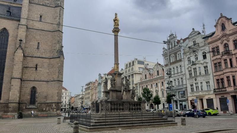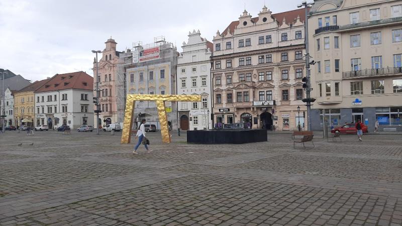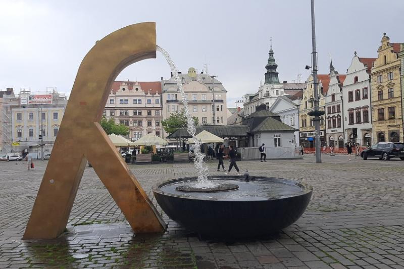 Moderní zlaté kašny a morový sloup na plzeňském náměstí Republiky
