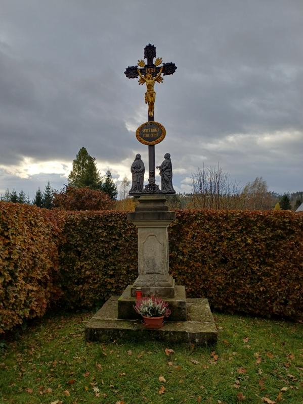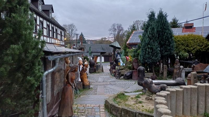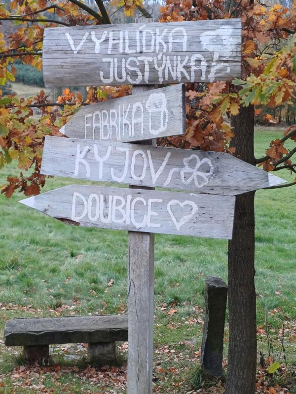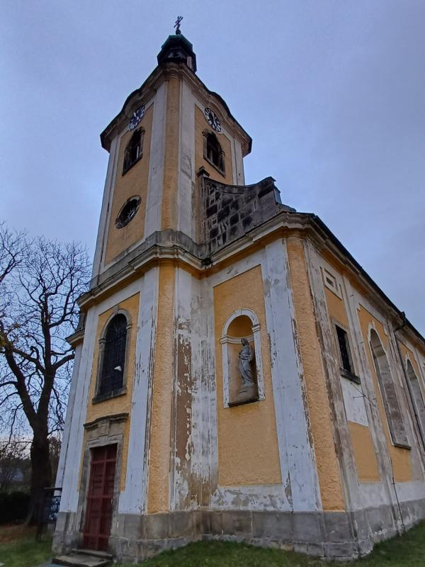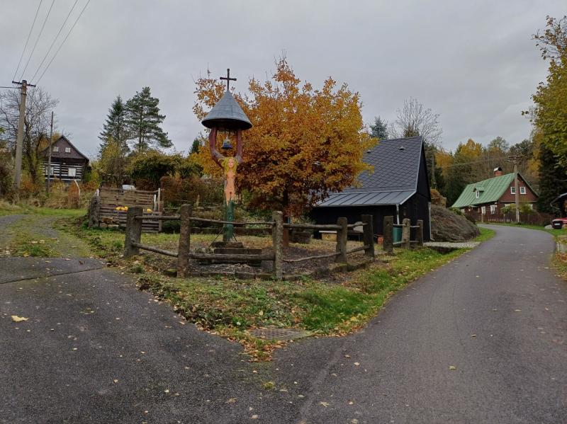 Cestou po hrázi vypuštěného místního rybníka je vidět dřevěná lodička, která uvízla v bahně. Jak může být stará a komu patřila? Od autobusové zastávky se loudají poslední turisté ke svým dočasným domovům. Areál plný dřevěných soch a kamenného bludiště opouštějí poslední rodinky s dětmi.V lehkém větru ševelí padající listí, svítí i okna bývalé fary, jen kostel se tyčí ve tmě. Možná se trochu stydí. Jeho oprýskaná fasáda obci valnou reklamu nedělá.