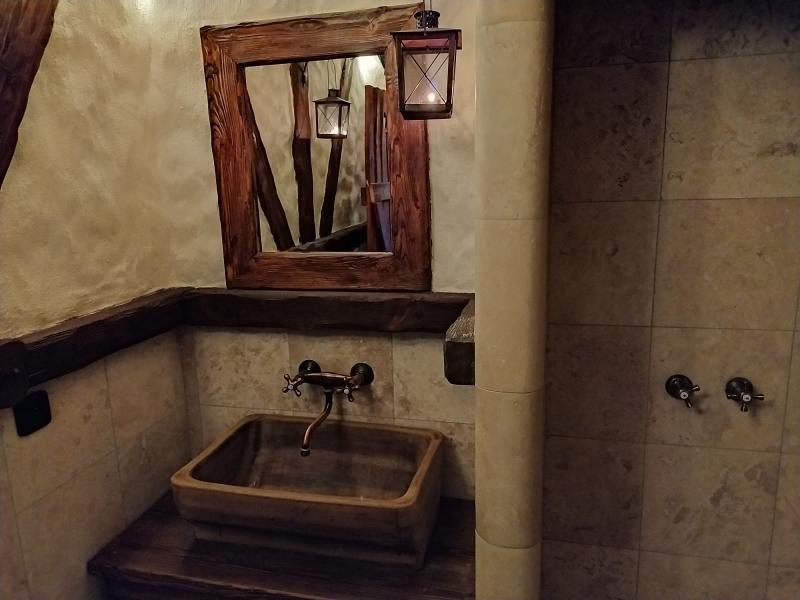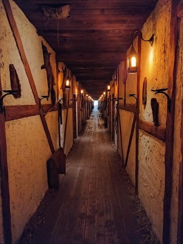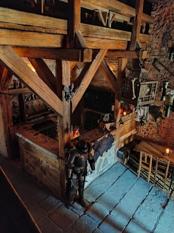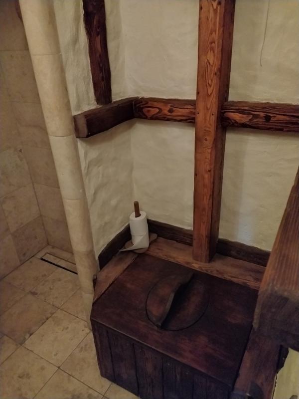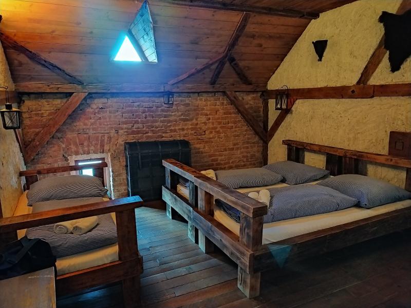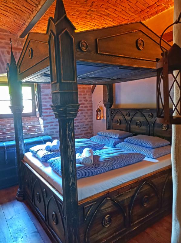 Pobýt můžete buď v tradičních pokojích nebo v rytířských. Chodba do pokojů je temná, osvětlena pouze malými lampičkami a na zemi se povaluje sláma. V tradičních pokojích se můžete ubytovat i s domácím mazlíčkem. Čeká na vás stylově vybavený pokoj a nechybí ani ,,latrína“. Sprcha je řešena skrz konev, kterou samozřejmě nelze nijak regulovat, takže menší diskomfort tu přeci jen je. Není se ale čemu divit, chcete přeci zažít středověk. Měkoučké postele také neočekávejte, na zemi se možná vyspíte lépe. Sice vás možná připravíme o malé překvapení, ale v noci tu dokonce opravdu straší – a to myslíme vážně! Jakým způsobem si však necháme pro sebe.