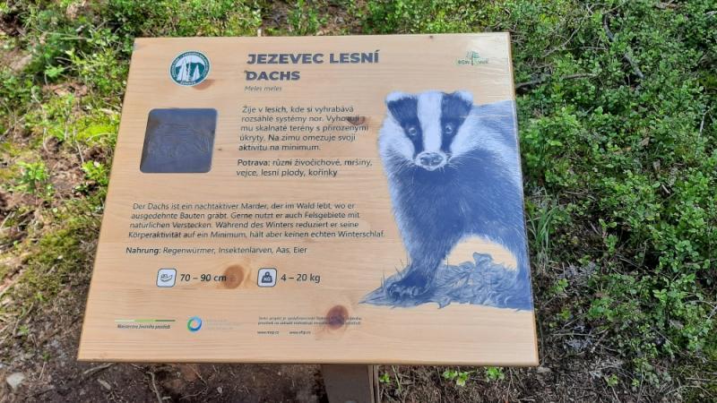 Stezka ve venkovním areálu představuje stopy jelenovitých a prasete divokého, také některé stromy a rostliny. Na budovu návštěvnického centra navazuje 2,5 kilometru dlouhý naučný okruh, podél kterého jsou rozmístěny lavičky na odpočinek či případnou svačinu. Jsou zde různé otázky, které se týkají zvířecí říše. Součástí stezky jsou také informační tabulky, kdy každá z nich se věnuje některému zvířeti žijícímu na Šumavě. U každého zvířete je informace o jeho velikosti a váze, potravě, kterou se živí a o prostředí, ve kterém žije. Součástí tabulek jsou i kovové reliéfy daných zvířat. Můžete si tedy s sebou vzít tužku, papír a zvířátka si na památku obkreslit. Tuto aktivitu jistě ocení vaše ratolesti.