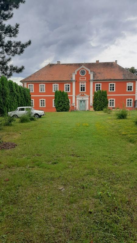 Hoštický zámek byl původně tvrzí, až v 2. polovině 18. století byla tvrz přestavěna na zámek v barokním slohu. Na zámku byly od té doby prováděny ještě několikery úpravy. V první polovině dvacátého století byla zámecká budova rozšířena o malé přístavky a další stavební úpravy areálu probíhaly bez ohledu na památkovou hodnotu i po roce 1948. Ve 2. dílu trilogie s názvem Slunce, seno a pár facek se zámek několikrát objevuje. Nejprve sem jde Blažena v šatech "co nosila stará Škopková do měšťanky" ukázat svatební oznámení, následně vesnické drbny v čele s Keliškou pomlouvají Blaženu před bránou zámku. Svatba Bláži a Šimona Pláničky se má konat právě zde, a tady se taky strhne velká mela, při které i pan farář dostane pár facek. Ve filmu je zámek žlutý, nyní má již červenou barvu. Zámek je v soukromém vlastnictví, prohlídky se zde nekonají. Dostanete se pouze před kovovou bránu.
