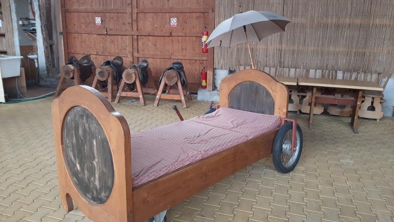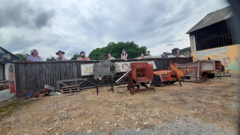 Ve filmu si zahrálo jednu z hlavních rolí tehdejší JZD. Dnes je před vstupem do areálu restaurace s názvem Ranč Šimona Pláničky. V areálu jsou vystaveny některé rekvizity, které si ve Slunce, seno zahrály. K vidění je zde například filmová ložnice Konopníků, postel babičky Škopkových a Vencova motorka. Nachází se tu také socha Máni Škopkové, která byla odhalena v roce 2012. Zdi jsou vyzdobeny malbami s výjevy z trilogie a nachází se zde také plastové makety jednotlivých postav z filmu. Ze za plotu vykukuje třeba Miluna, Blažena, Venca nebo Škopková. Na trávě parkuje filmový autobus. Areál bývalého JZD stále funguje jako zemědělský podnik, ale krávy zde již nechovají. K vidění jsou tu také některé starší zemědělské stroje. Do areálu se platí malé vstupné ve výši 35 korun. Kromě vstupenky si ve stánku můžete zakoupit také upomínkové předměty jako hrnečky, propisky, samolepky, pohledy a další suvenýry.
