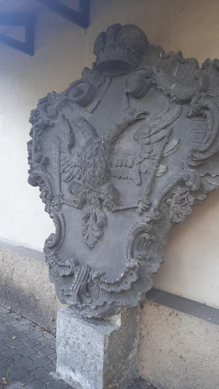 Štít z pískovce symbolizuje Rakousko-Uhersko, byl osazen na průčelí staré radnice na I. náměstí starého Mostu v době, kdy sloužila jako krajský soud. Po demolici radnice v letech 1881-1882 byl přenesen na střechu nové budovy krajského soudu, kde vydržel až do vzniku Československa.