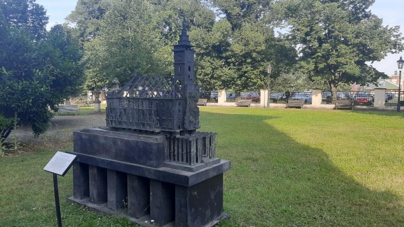 Plastika představuje skelet děkanského kostela ve stádiu přesunu. Oproti skutečnost je opatřena i kostelní věží, která byla před přesunem odbourána a naopak chybí střešní krytina, která tehdy zůstala zachována. Má to především symbolický význam - kostel si sice zachovává svou figuru, ale je naprosto vyprázdněný. Prolamovaný podstavec může evokovat poddolované území, členěné pilíři, jako v hlubinném dole.Štít s dvouhlavým císařským orlem