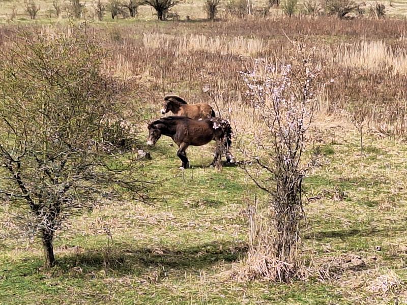 Naše značky vedou podél jižní ze dvou pastvin. Za druhou vyhlídkovou plošinou se ohradník i značky otáčejí k severu a brzy dojdeme k třetímu vyhlídkovému místu. Tady se nejedná o vyhlídkovou plošinu, nýbrž o přírodní kopeček v rezervaci, na který je umožněn přístup. Při troše štěstí uvidíme pasoucí se zvířata.Exmoorský či keltský pony je plemeno koně domácího, které pochází z anglických hrabství Somerset a Devon, kde dosud divoce žije. Plemeno dostalo jméno podle vysoko položených blat Exmoor v jihozápadní Anglii. Jeho výhodou je, že nepotřebuje lidskou péči a především spásá i agresivní rostliny, kterým se jiná zvířata vyhýbají.