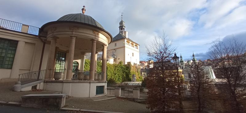 Procházkou proti toku říčky Teplé se dostaneme až k bohatě vyřezávané Tržní kolonádě, která nám nabídne své tři prameny.