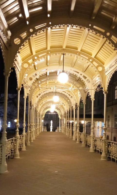Dřevěná kolonáda ve švýcarském stylu, bohatě zdobená řezbami, byla postavena na místě staré karlovarské radnice v letech 1882 – 1883.