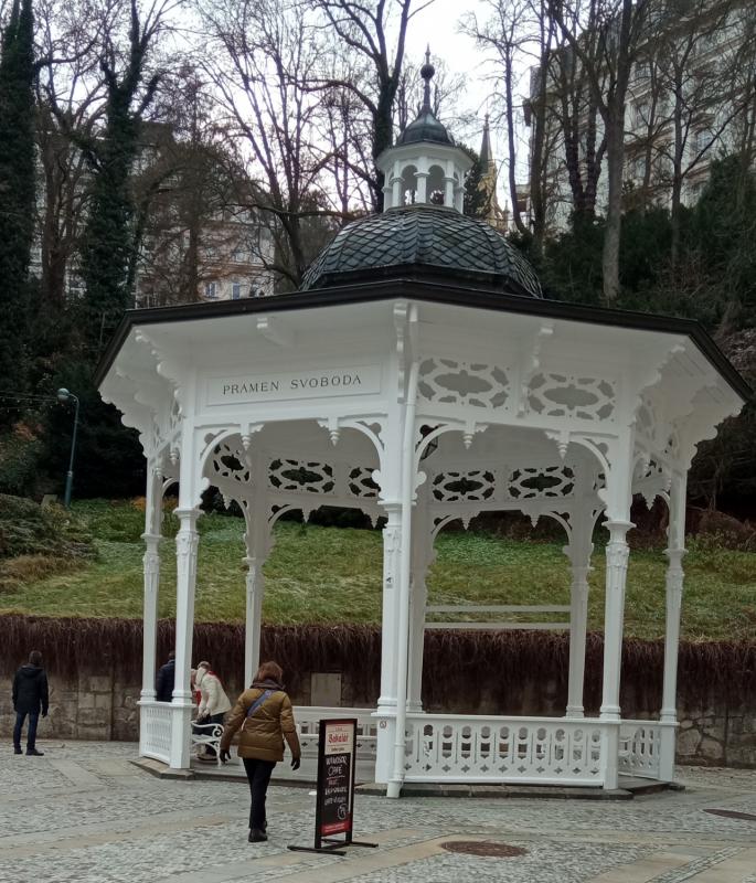 Pokračujeme po Mlýnském nábřeží a ještě než dorazíme k Mlýnské kolonádě, ochutnáme pramen Svoboda, který vyvěrá v samostatném altánu.