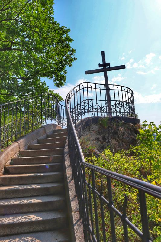 Dříve tu stával velký dřevěný kříž s plastikou ukřižovaného Krista. Skalní vrcholek byl v průběhu let upraven a doplněn schody, aby se stal navštěvovanou vyhlídkou pro hosty a turisty. Roku 1991 byl krucifix vyměněn za jednoduchý dřevěný kříž. V roce 2011 byl pak celý vyhlídkový ochoz i kříž rekonstruován.