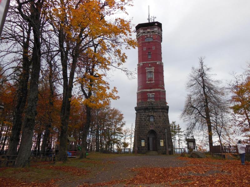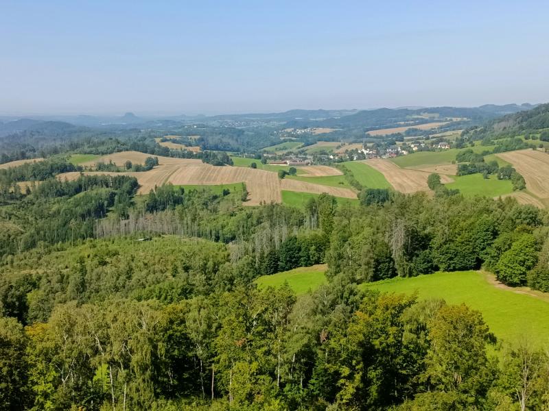 Z věže se naskýtá nádherný kruhový výhled. Lze z ní dohlédnout až k Jizerským horám a Krkonoším, na jihu se ukazují výšiny Českého středohoří a na západě je pak výhled na hřeben Krušných hor. V popředí leží pískovcové skály Labských pískovců a přilehlá část Saska. Za pěkného počasí jsou vidět i Drážďany, Ještěd, Buková hora nebo Děčínský Sněžník.