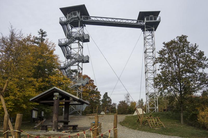 Směrem k východu se vrcholy Zlatohorské vrchoviny stále snižují, přetínají Osoblažský výběžek a končí u Města Albrechtice. V tomto výběžku sice najdeme dřevěnou rozhlednu na vrchu Strážnice severně od obce Liptaň, z které lze také částečně vidět na polské území, avšak pro nás není zajímavá, protože od roku 2023 je z technických důvodů uzavřena. Pochází z roku 2003 a je zřejmě na hranici životnosti. To je osud dřevěných rozhleden, který závisí na kvalitě použitého dřeva a na pravidelné údržbě. Vydáme se proto na jih k posledním kopcům u Města Albrechtice (něm. Olbersdorf). Na Hraničním vrchu (536 m) tu stojí unikátní rozhledna, přesněji dvourozhledna.