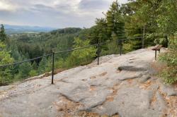 druhá má jedinečně chutná křupavá jablíčka, dále uvidíte místo s betonovým monolitem a s letopočtem 1720-1884. Jistě si budete chvíli hádat co to mohlo být? Vpadá to jako sloup k lanovce nebo podpěra mostu, ale nebudeme Vás napínat a prozradíme. Nejedná se o nic jiného než o pomník bývalého německého střeleckého spolku, který je ve tvaru hledí a mušky.Pokračujte stále po modré až se cesta zúží na pěšinku, kterou vystoupáte až k odbočce na vyhlídku Jehla. Zde se vydáte po krátkém čedičovém schodišti lemovaném kovovým zábradlím až se před Vámi otevře nádherný výhled na Českou Kamenici, Kamenický Šenov, zalesněné kopce Lužických hor a další místa.
