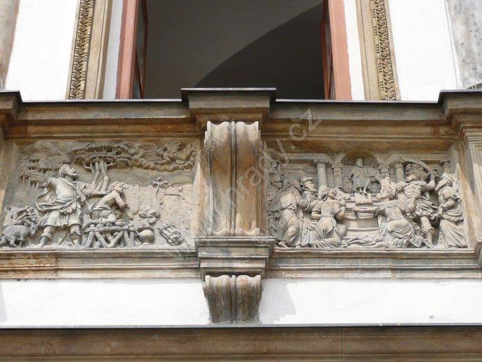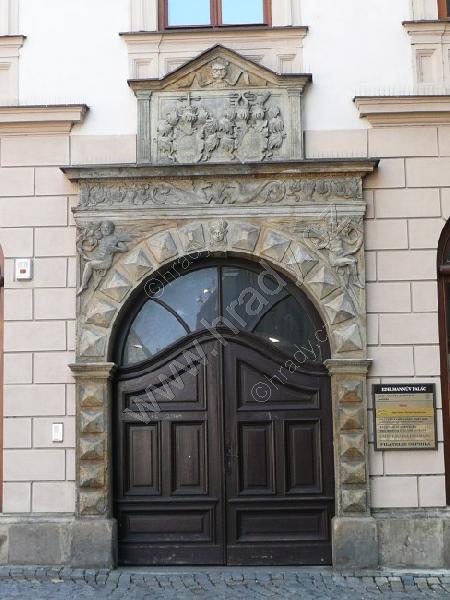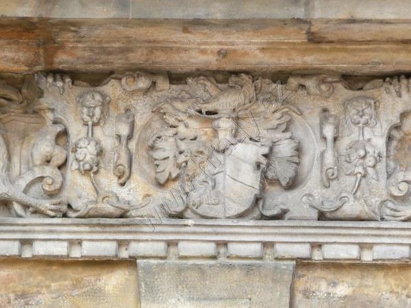 kamenný erb v bohaté kamenické výzdobě vstupního portálu paláce