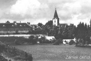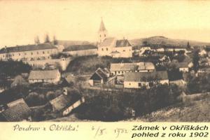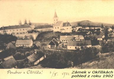 Pohled na zámek a kostel v Okříškách z r. 1902