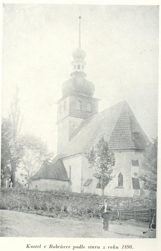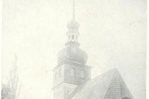 Věž kostela v Okříškách v roce 1960