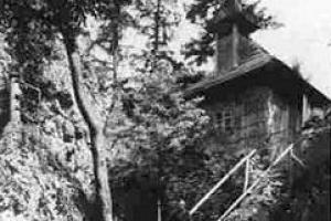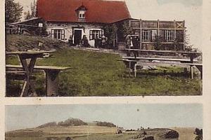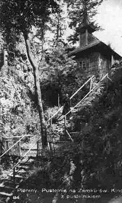 poustevna s poustevníkem na meziválečné pohlednici