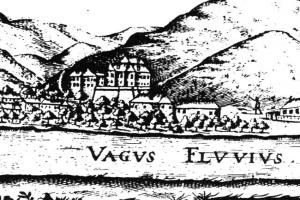 Považský hrad s obcí Považské Podhradie, kde jsou situovány Starší a Nový zámek, na kresbě z roku 1676