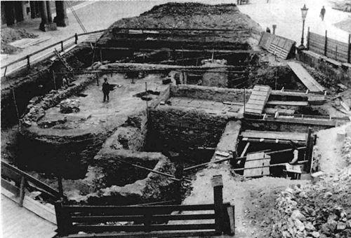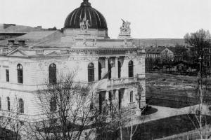 pohled od jihozápadu během rozebírání původního krovu na přelomu čevna a července 1896