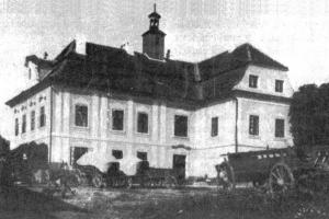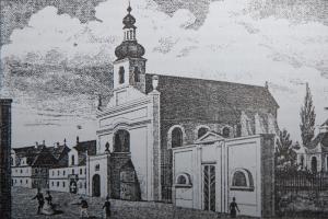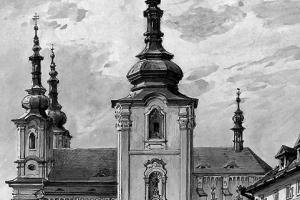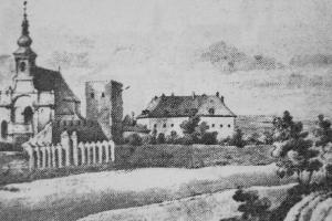 zámek a přilehlý johanitský kostel na kresbě F. Biely z r. 1813