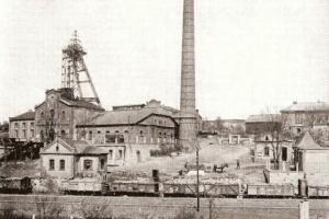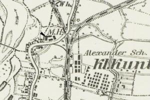 pravděpodobný blok zámku je označen šipkou. Vravo areál dolu Alexandr. Středem vede železniční dráha Ostrava - Frýdek