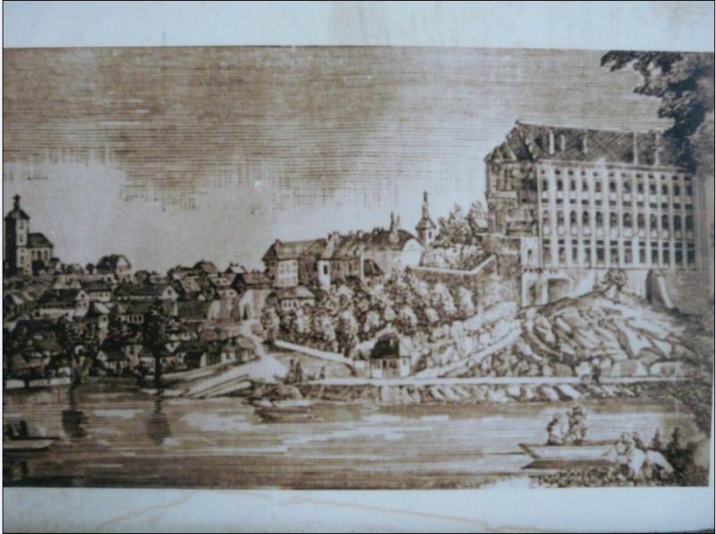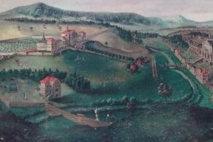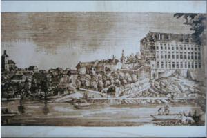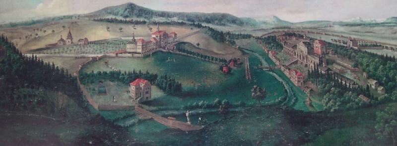 Kuks - Pohled kolem r.1724 - vlevo Hospital, vpravo lázně - z infocedule na Kuksu