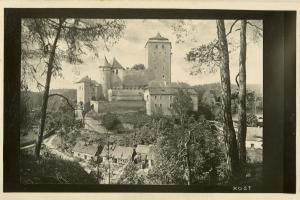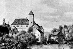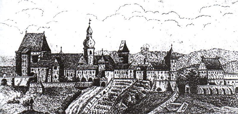 vlevo mohutná silueta vysokého presbyteria klášterního kostela, zvonice (s bání), mezi dvěma nižšími věžemi se rozkládá vlastní hrad, k němuž obě věže se stanovými střechami patří.