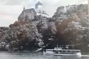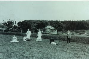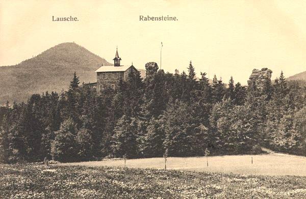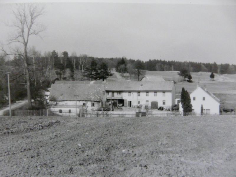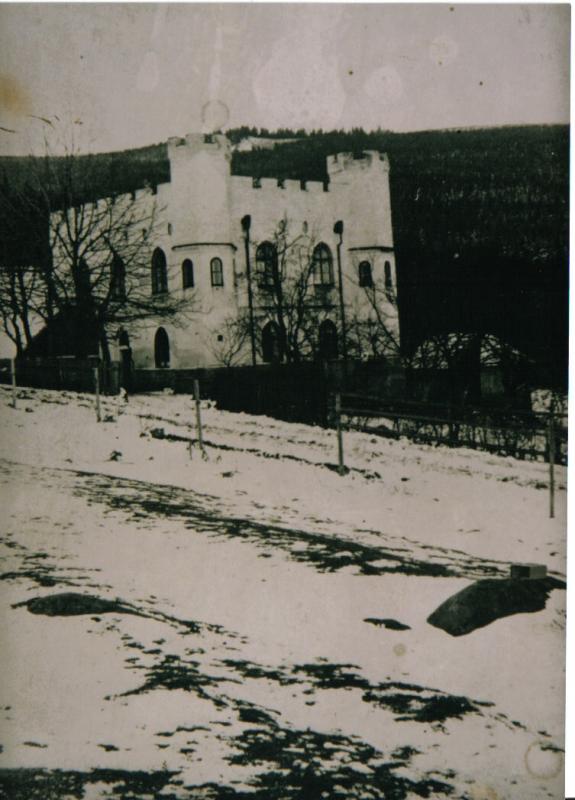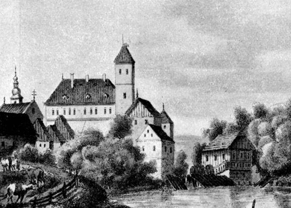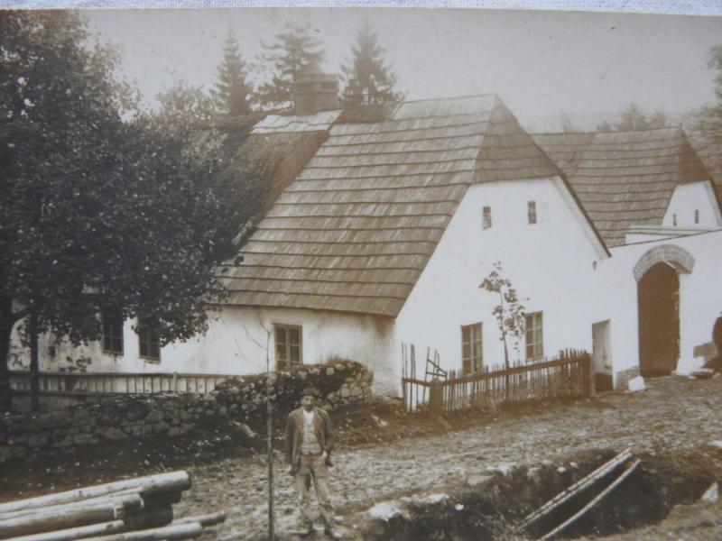 Vlevo zámeček, vprostřed bávalý seník a na pravé straně je vidět již neexistující pstruhová líheň zmiňovaná K. Klostermannem, v jeho době ( koncem 19. stol.) býval zámeček opravdu červený, jak popisuje v textu.