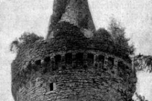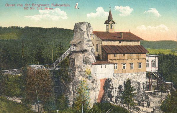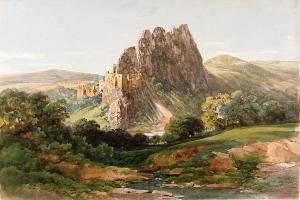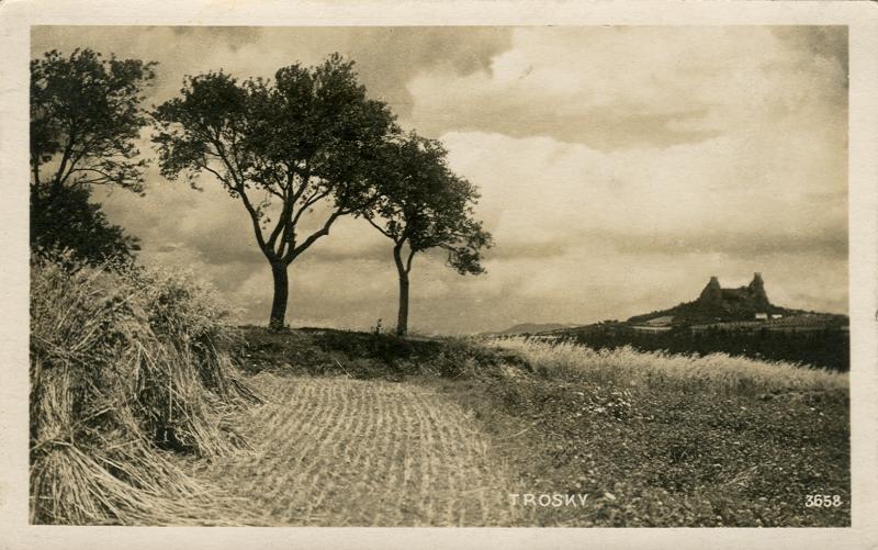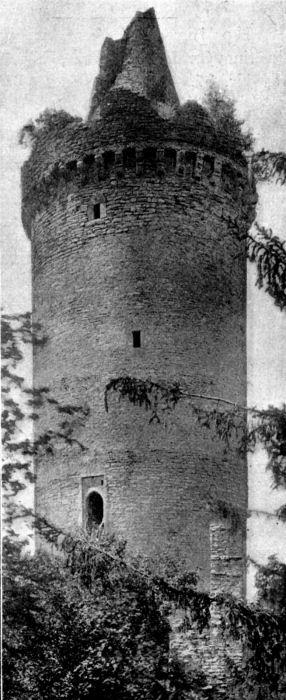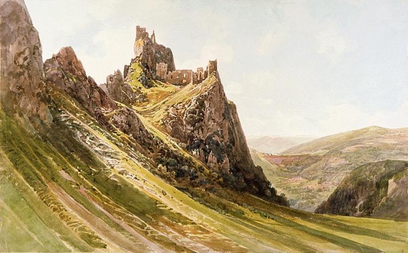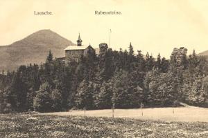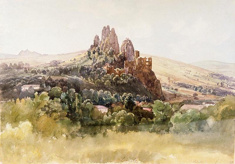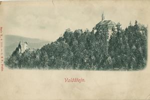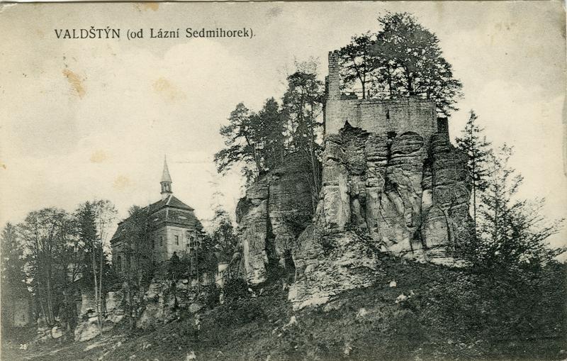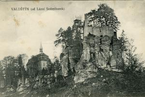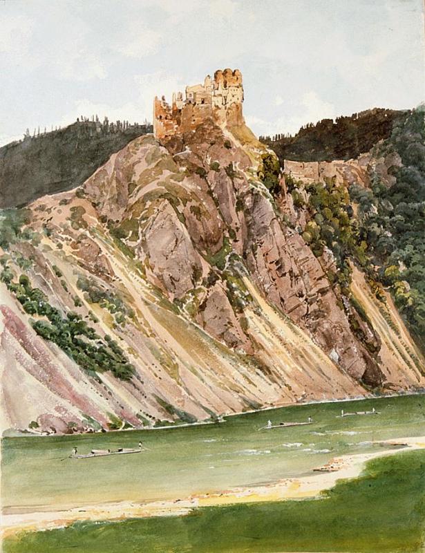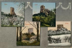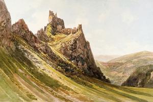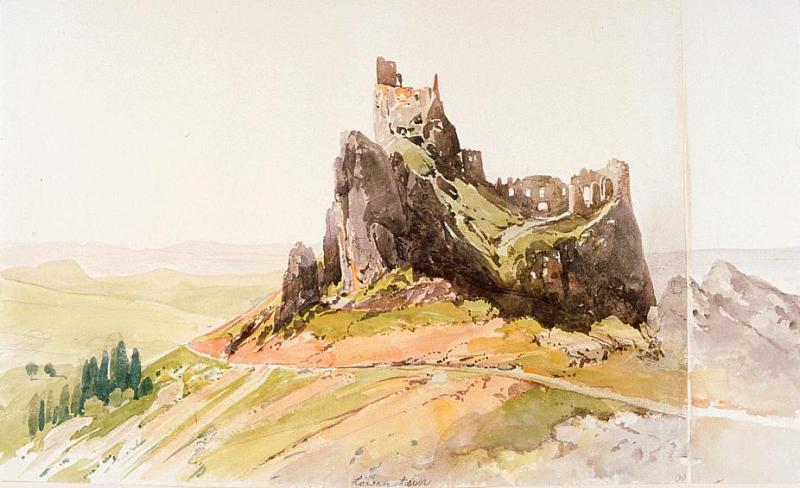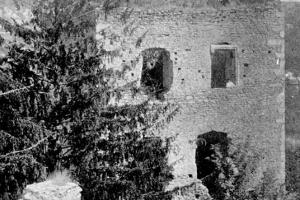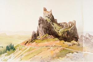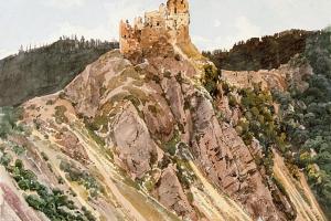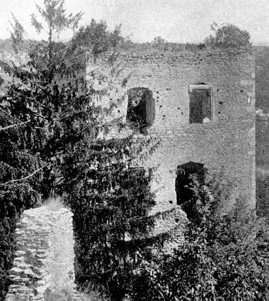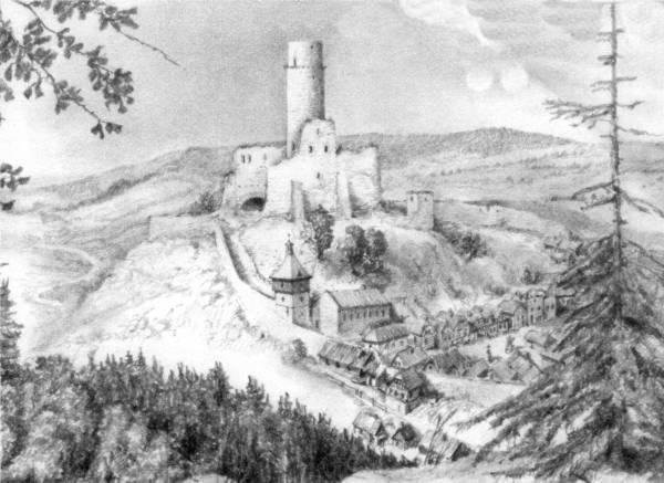 stará kresba hradu ještě se zbytkem horního paláce s valenými sklepy a věžicí pod věží. Pohled od jeskyně Šipka