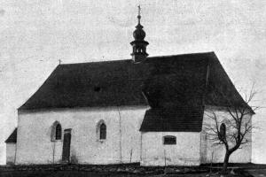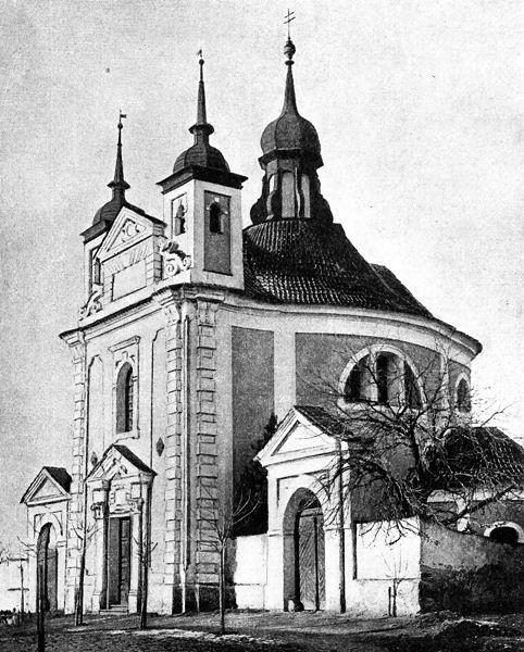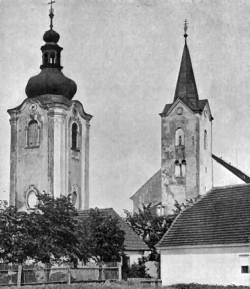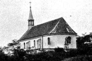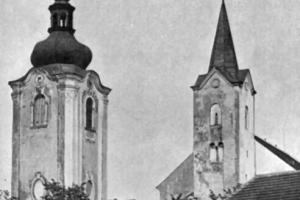 V pozadí kostel Nanebevzetí Panny Marie. V popředí zaniklý evangelický kostel z roku 1902 zničený požárem v roce 1982.