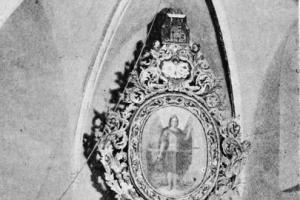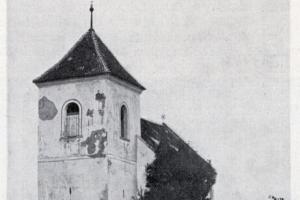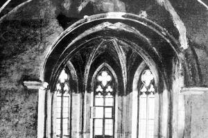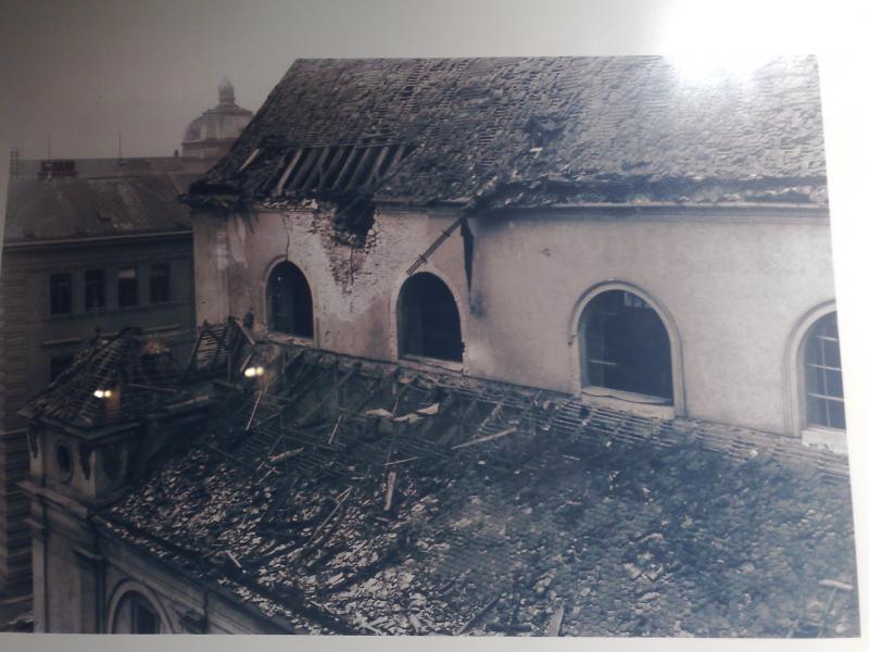 historická fotografie z kostela. Obrázek zachycuje zničenou střechu po náletech z 2.světové války