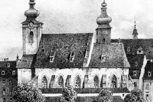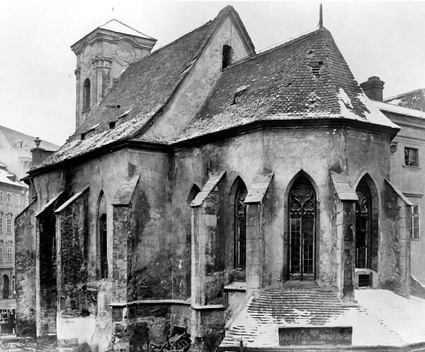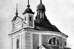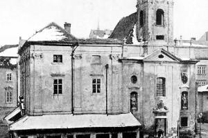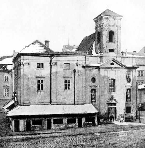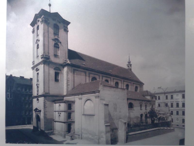 Obrázek z interiéru kostela zachycuje definitivní podobu kostela po zbourání Jezuitských kolejí kolem roku 1910
