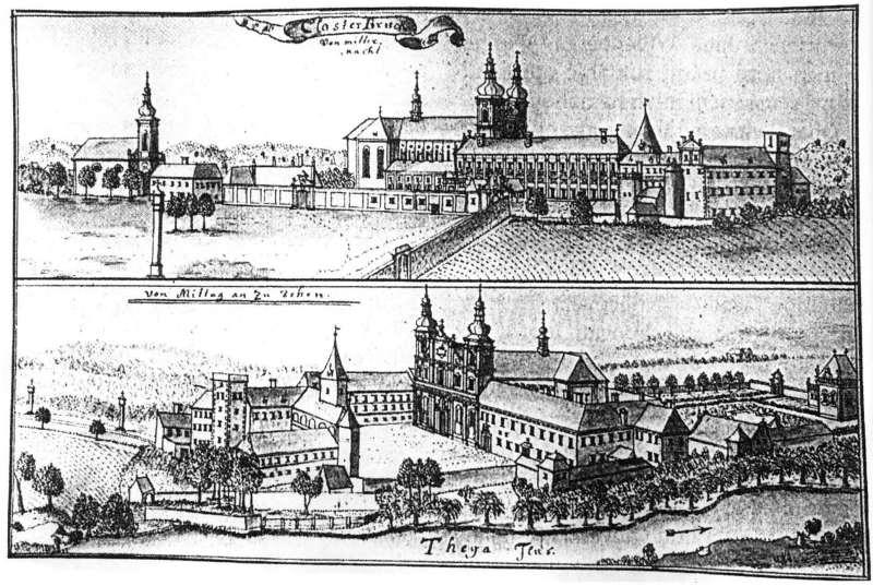 dva pohledy na komplex premonstrátské kanonie s kostelem a hradu ve 2. čtvrtině 18. století
