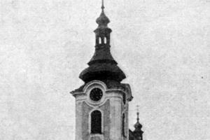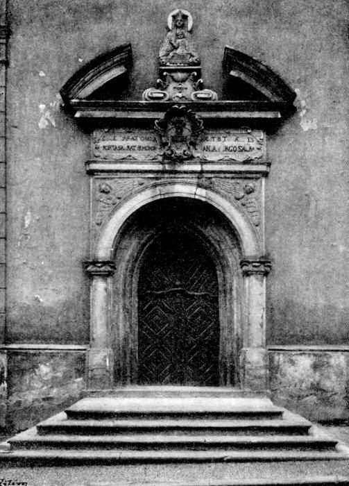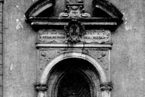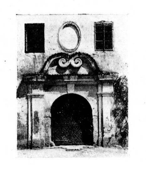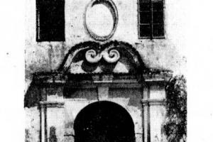 barokní hlavní portál in situ, před přenesením při novogotické opravě