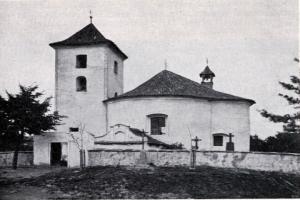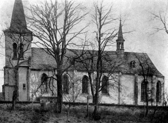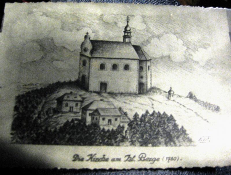 Rodinnný pohled z pokladů staré skříně, zobrazující původně ještě nezalesněný a přístupný kostelík na kopečku, kresleno směrem od nynějšího Křížového vrchu.