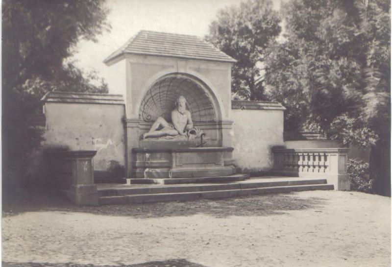 Barokní socha Neptuna se studnou ve Sklepní ulici poblíž zámku. Historická fotografie z poč.20.století - soukr.sbírka IvoR