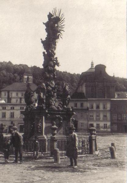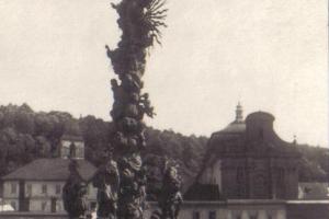 Fulnek - Sloup Nejsvětější Trojice na fotografii z počátku 20.století (soukr.sbírka IvoR)