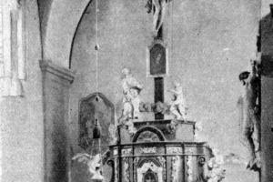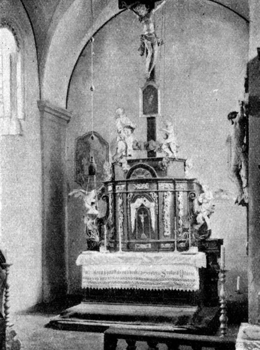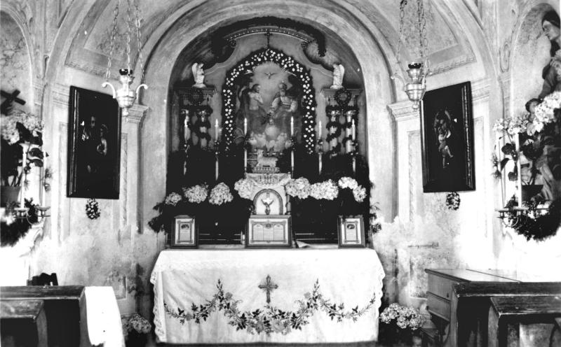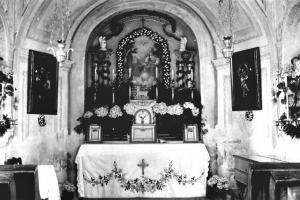 Obrázek zobrazuje interier Kaple Nejsvětější Trojice v dobách zašlé slávy, v kapli se dokonce sloužily mše, o čemž svědčí vybavení.