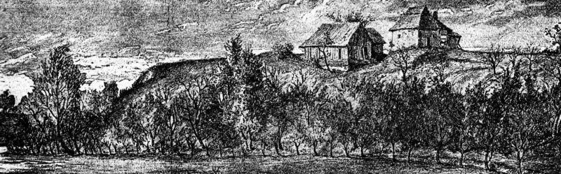 kostel se zvonicí od východu v 19. století na kresbě K. Liebschera