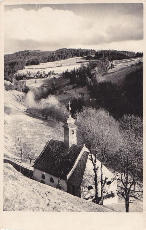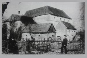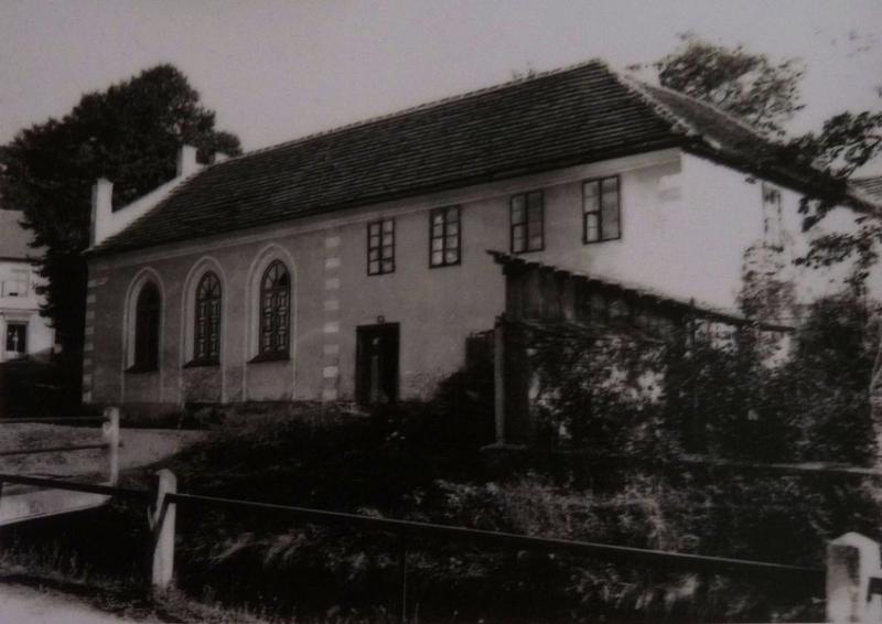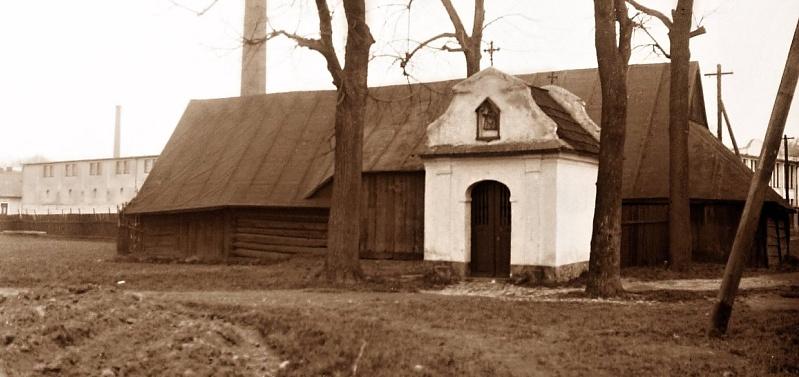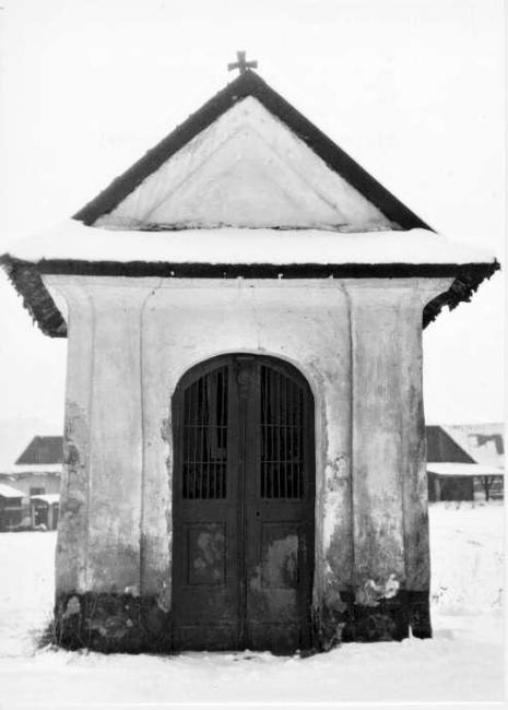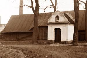 udržovaná kaple s historickou roubenou stodolou v pozadí, kolem r. 1928